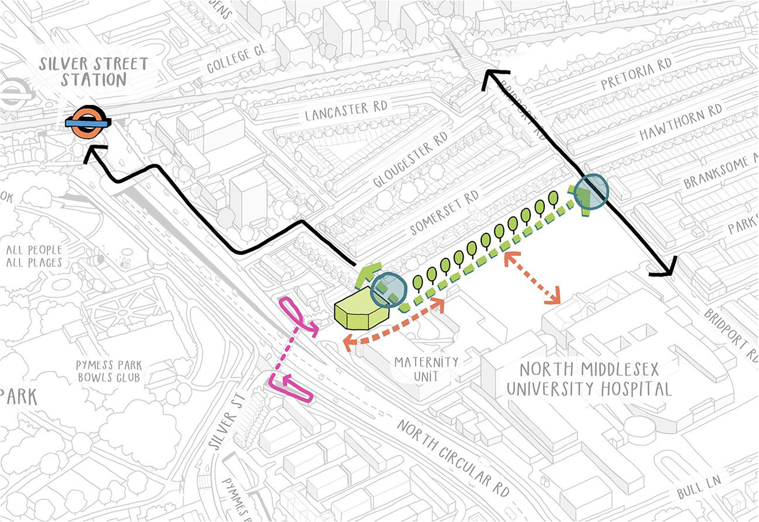 Alongside the new homes and green spaces, we will provide new community facilities including a new nursery and a community café overlooking the central park. The site will incorporate public realm improvements to benefit the whole community, with hospital entrances made to be safer and more welcoming, ensuring the site feels open and easy to navigate.